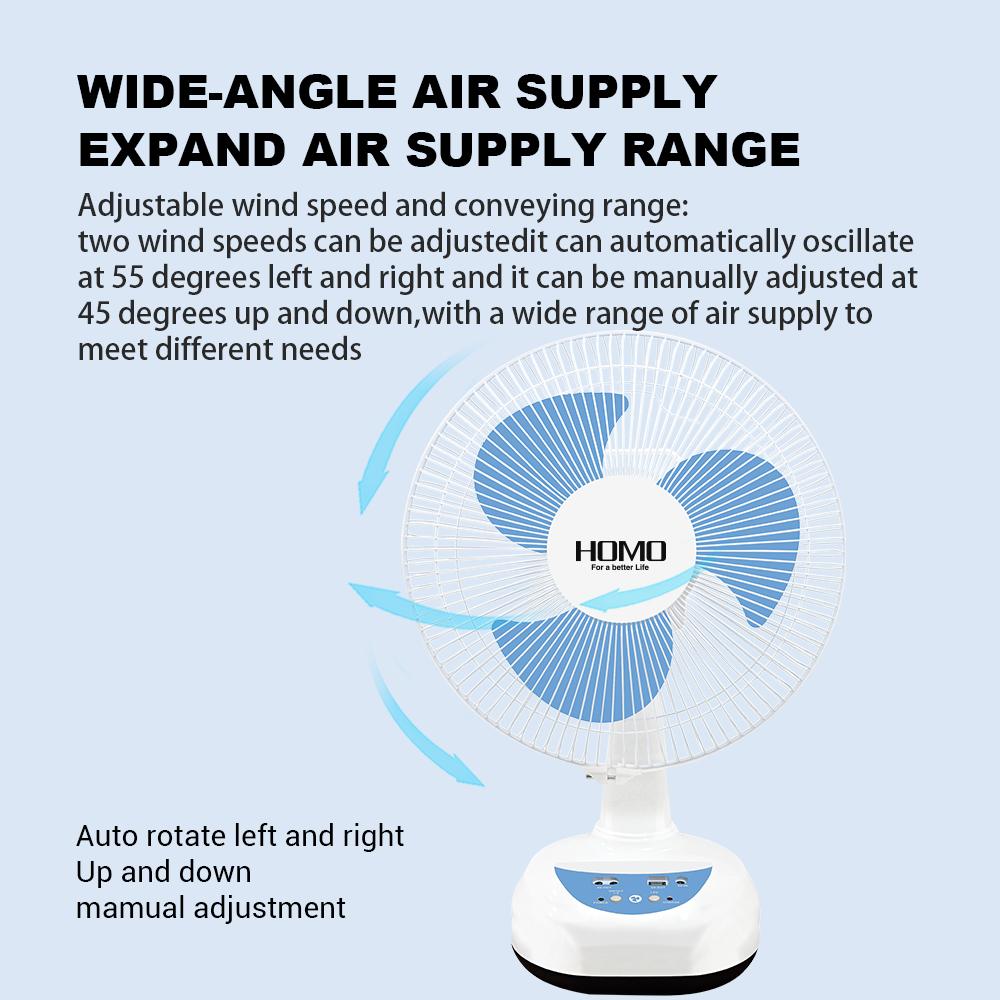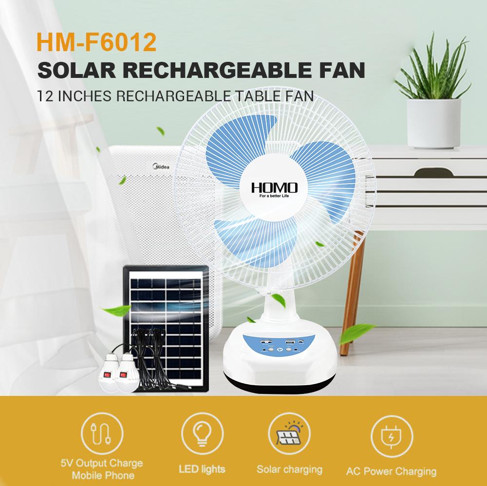 HOMO Solar Rechargeable Fan 12" 2 LED Lights 220V AC | 3 Speed Choice | Desktop Electric Fan | Outdoor Fan